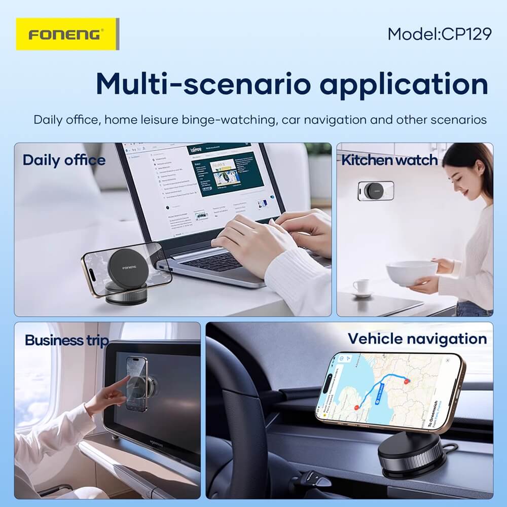 FONENG CP129 یک نگهدارنده (هولدر) موبایل چندکاره است که با ترکیب جذب مغناطیسی و فناوری مکش (وکیوم) طراحی شده است. این محصول به منظور فراهم کردن تجربهای ایمن، انعطافپذیر و مناسب برای استفادهی بدون دست (hands‑free) در خودرو، میز کار، آشپزخانه و سایر مکانها عرضه شده است.